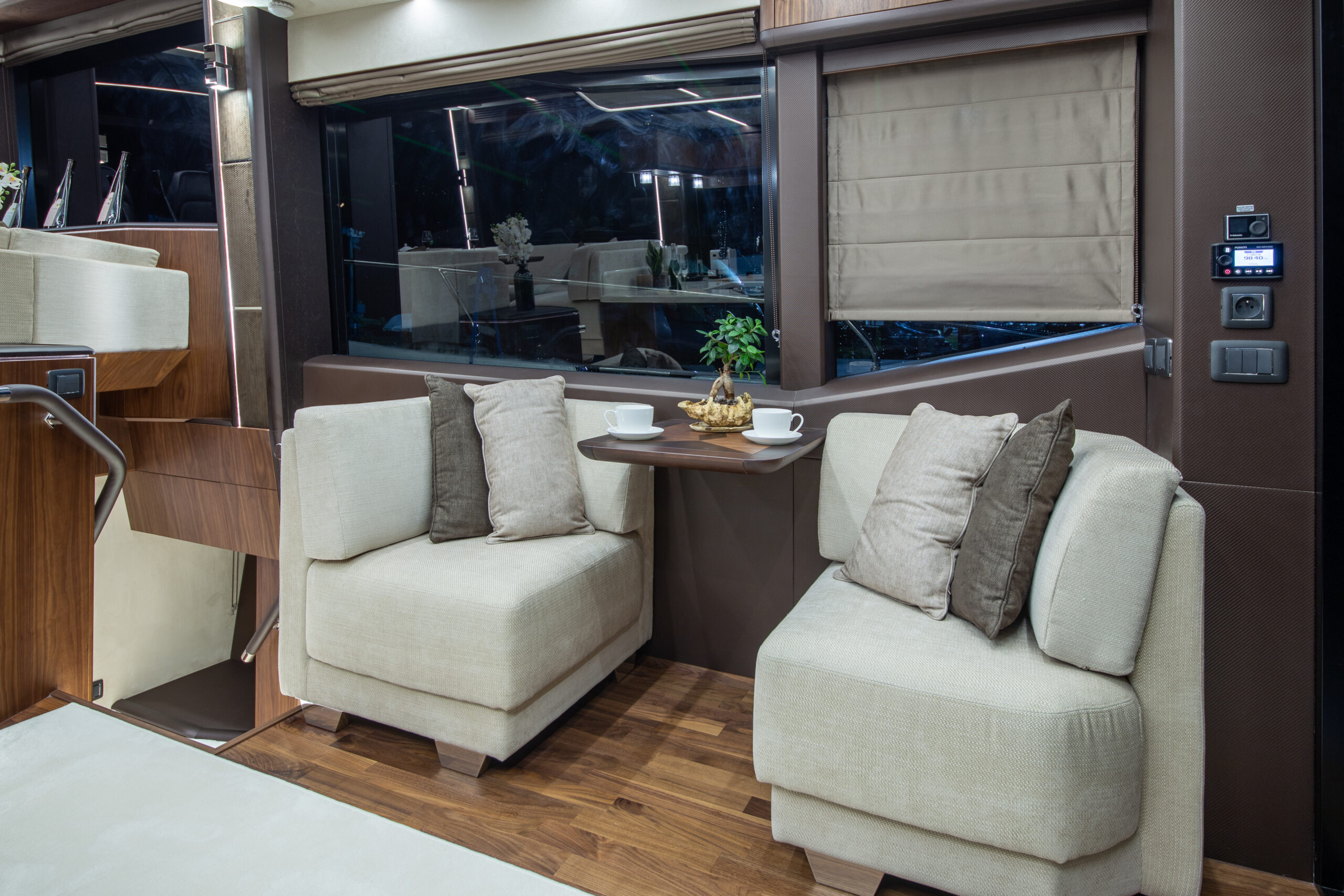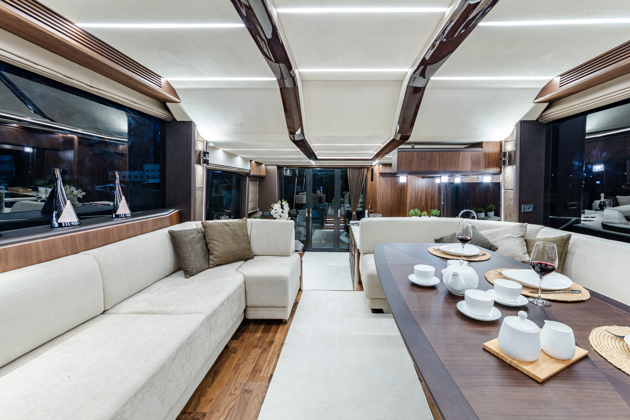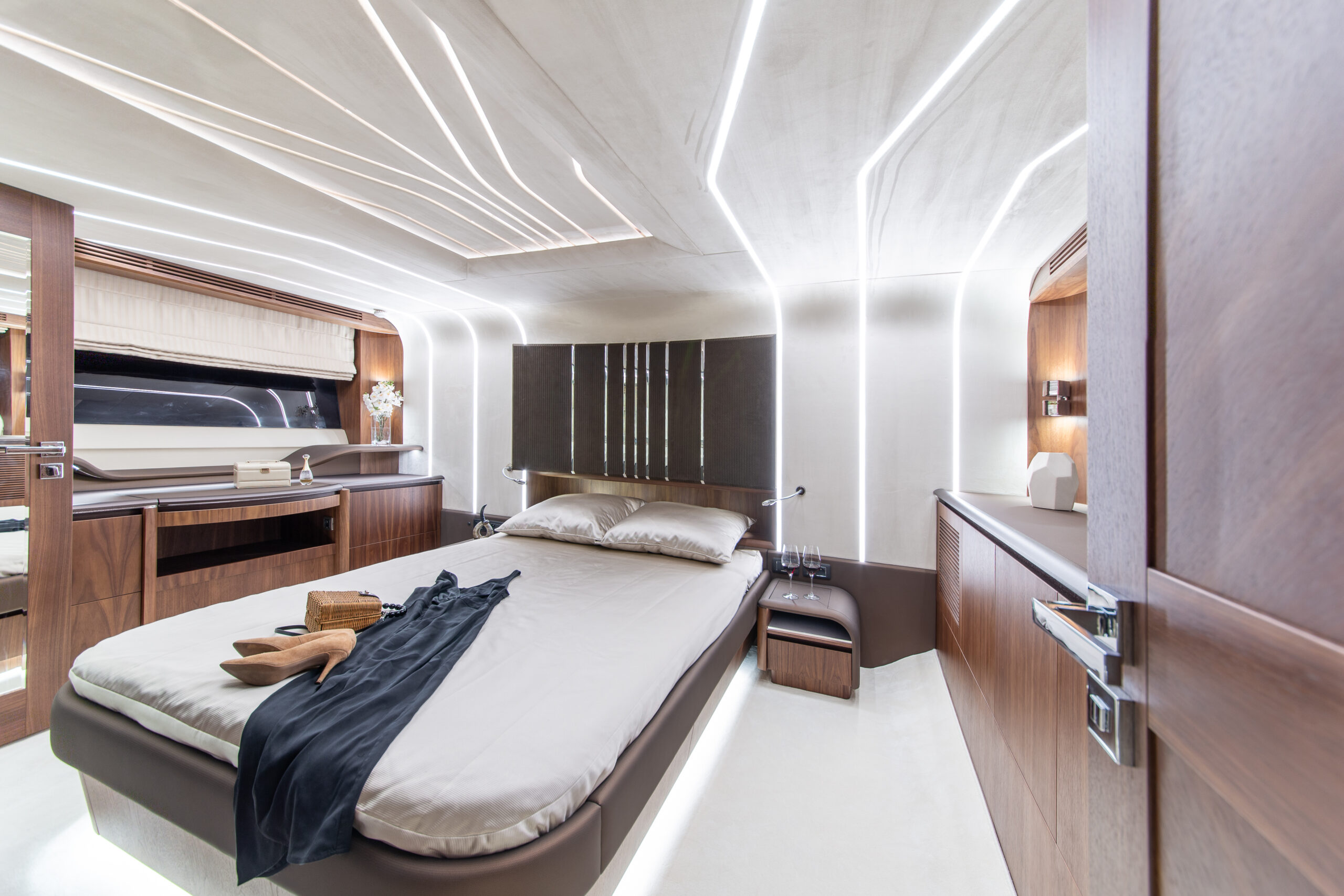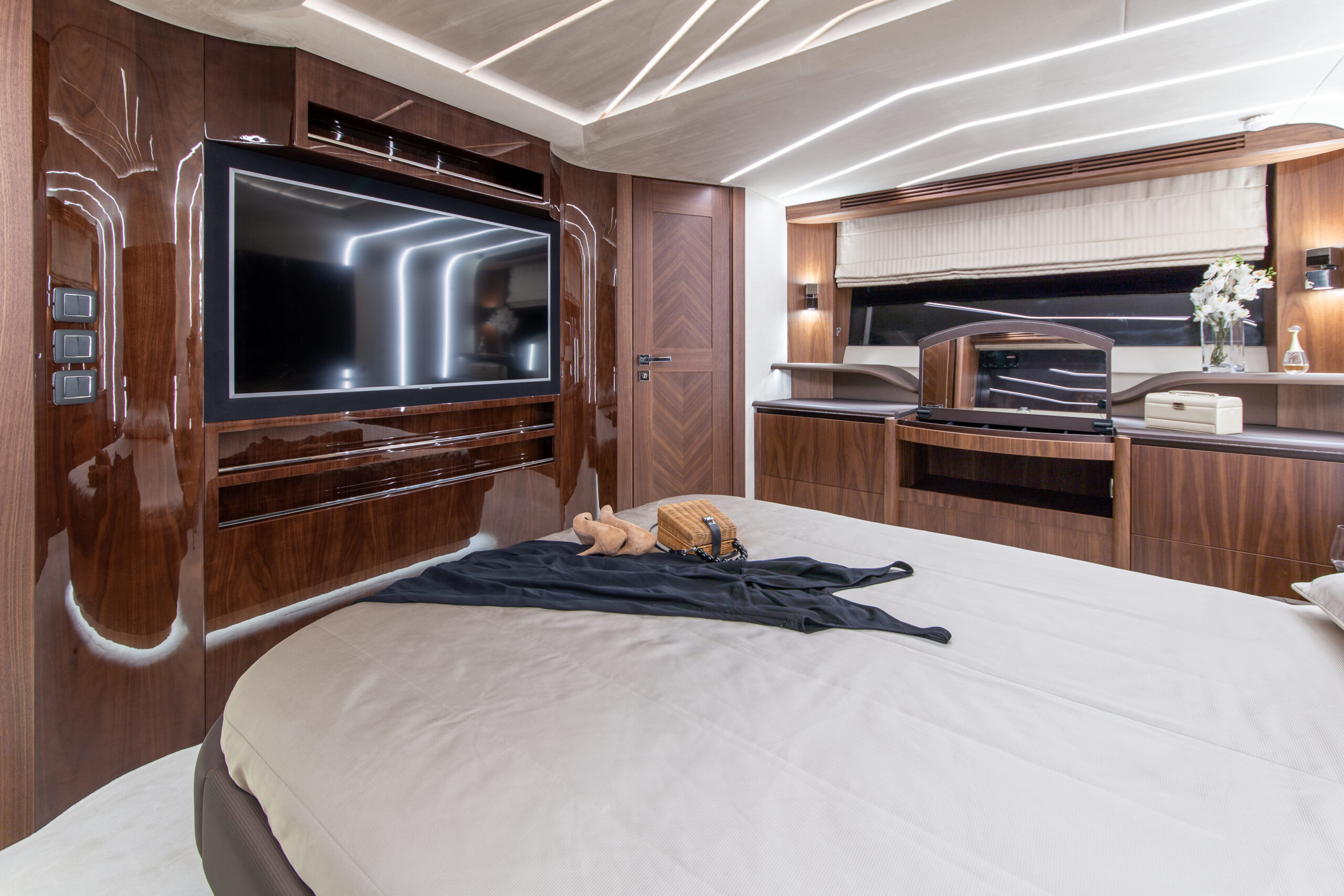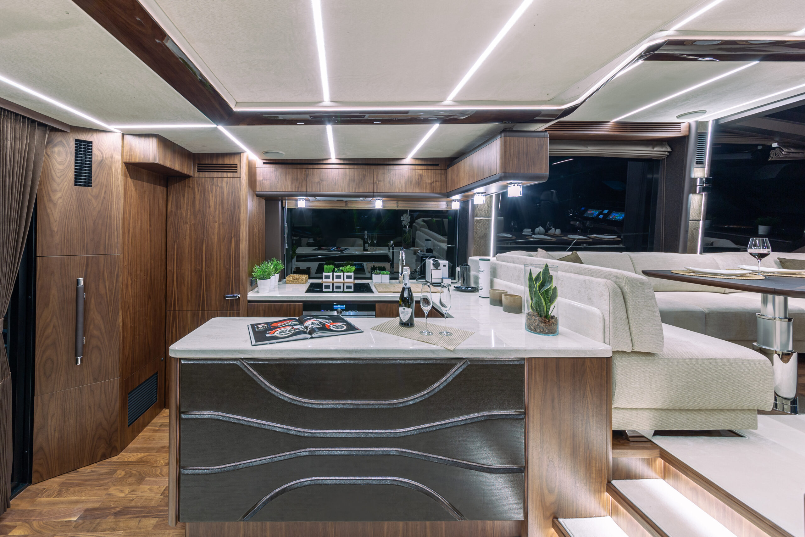 The Galeon 680 FLY seamlessly combines timeless elegance with modern innovation. Its classic hull is paired with a revolutionary “Floating Design” interior concept, inspired by the graceful curves of waves. This unique design blends matte and glossy woodwork with rounded, wavy elements, delivering a sophisticated and contemporary aesthetic.