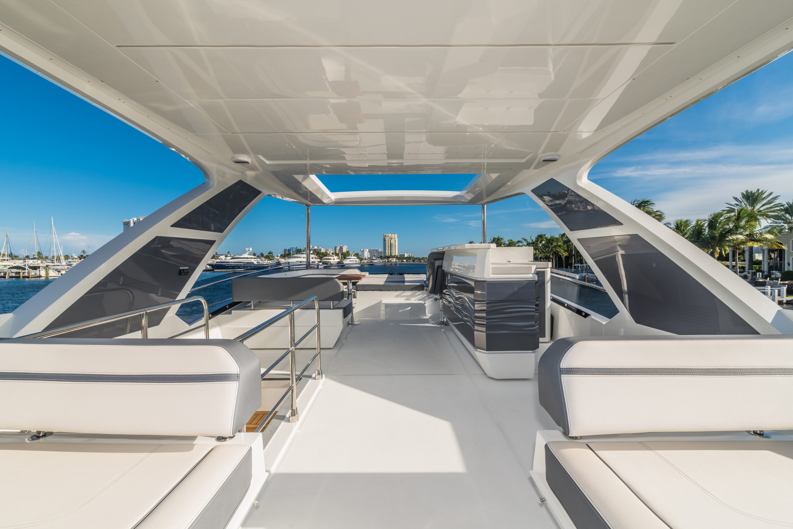 The class-leading flybridge, designed with a “Smart Layout,” features a bar and a spacious recreational area that can comfortably accommodate over a dozen guests. The bow area is available in two configurations: one with multifunctional power sofas and tables, and the other offering a traditional sundeck with a large sofa for relaxation.