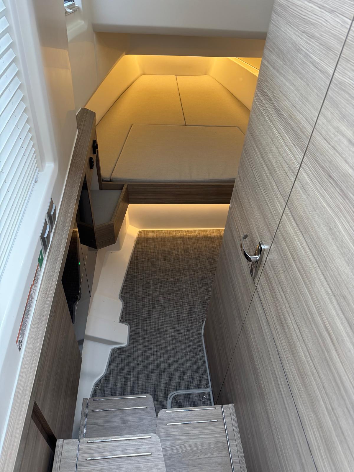 Below deck, two staircases lead to the double cabins – forward and amidships – sharing a bathroom, with an optional third berth for kids.
